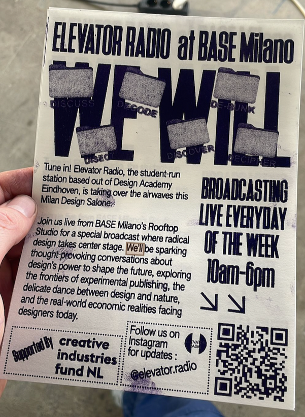 Elevator Radio is a radio station operated by students and alumni of Design Academy Eindhoven. With the medium of live broadcasting and audio, it serves as an "urgent publishing" platform, amplifying voices and providing space for experimentation and collaboration within the design community. During Design Week, on BASE Milano's rooftop, Elevator Radio presents a journey into radical design, redefining reality and imagination.