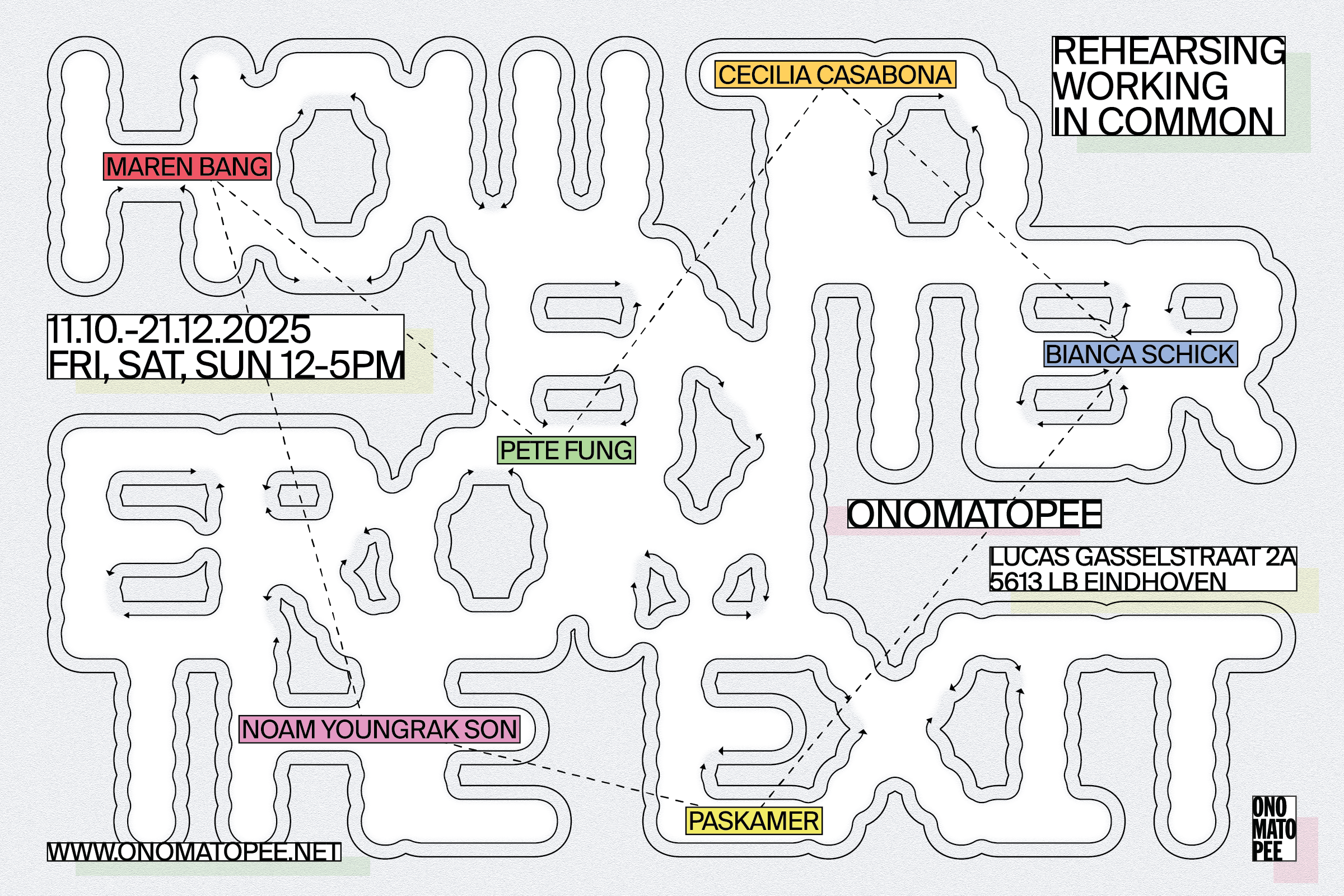 How to enter from the exit is a research-driven and collective curatorial experiment that reimagines cultural institutions as systems shaped by collaboration, experimentation, and shared knowledge. The exhibition brings three installations together with a shared platform for visitors and cultural workers to join in. By occupying Onomatopee’s spaces, it reveals behind-the-scenes processes of institutional life while opening room to imagine new ways of working together.